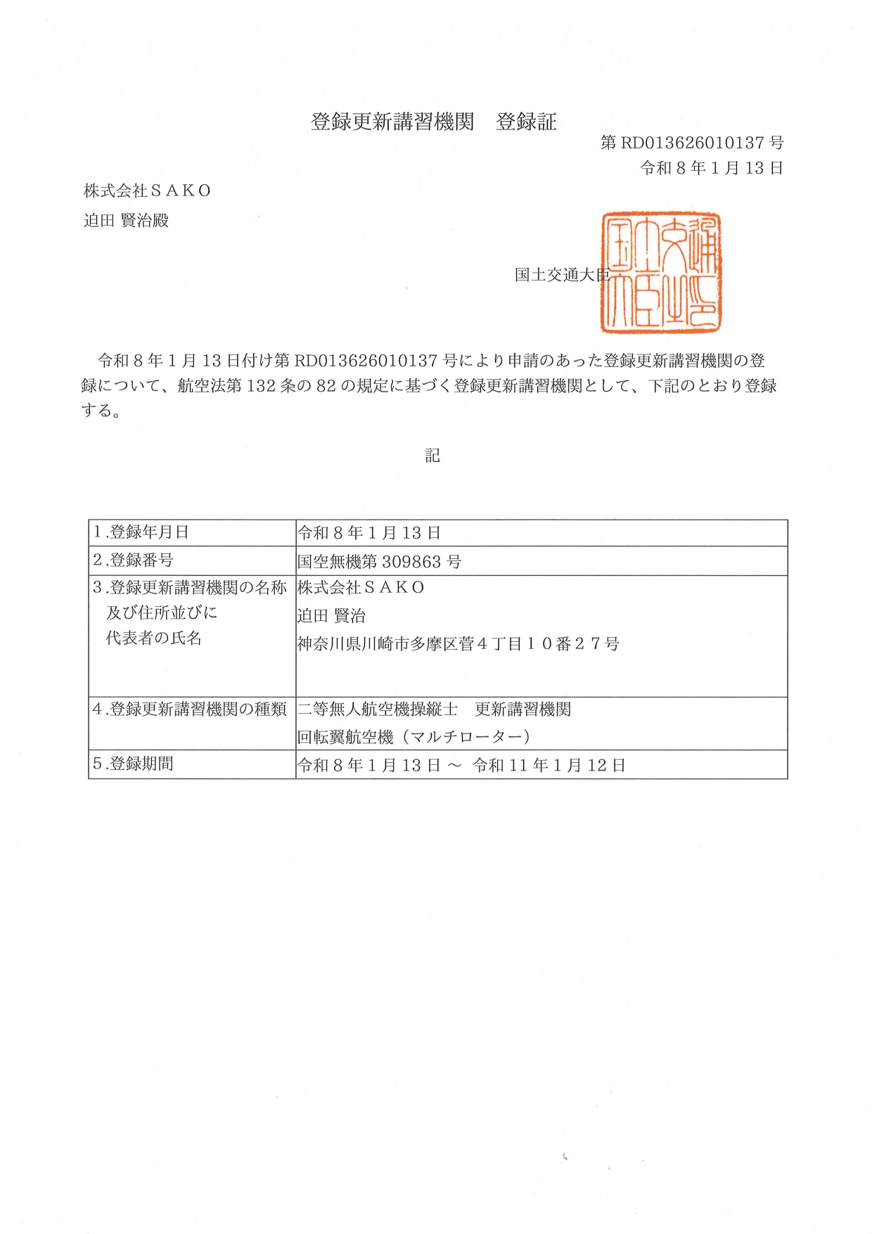 【二等】更新講習機関登録証